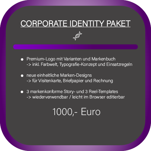 Präsentiere deine Marke mit einem unverwechselbaren visuellen Auftritt, der Wiedererkennung garantiert und Eindruck hinterlässt. Dieses Paket umfasst eine maßgeschneiderte Markenidentität, welche die visuelle DNA deines Unternehmens widerspiegelt – inklusive Logo, Farbwelt, Typografie und visuellen Leitlinien.