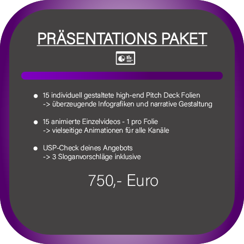 Wenn deine Präsentation wirklich mal essenziell ist und sitzen muss, brauchst du sie professionell gestaltet und getextet – genau dafür sind wir da. Dieses Paket liefert dir 15 Folien für einen maximal qualifizierten Auftritt.