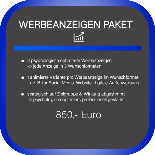 Nutze die volle Kraft professioneller Werbeanzeigen und lass deine Botschaft die richtigen Menschen fesseln. Dieses Paket liefert dir drei professionell nach Werbepsychologie gestaltete Werbeanzeigen; jede davon in drei Wunschformaten, genau abgestimmt auf dein Einsatzgebiet. Und um auch online zu überzeugen, kommt jede Anzeige zusätzlich als animierte Variante für einen gekonnten Webauftritt. Teile uns dein Angebot mit, und wir entwickeln daraus Anzeigen, die nicht nur gut aussehen, sondern auch auffallen und performen.